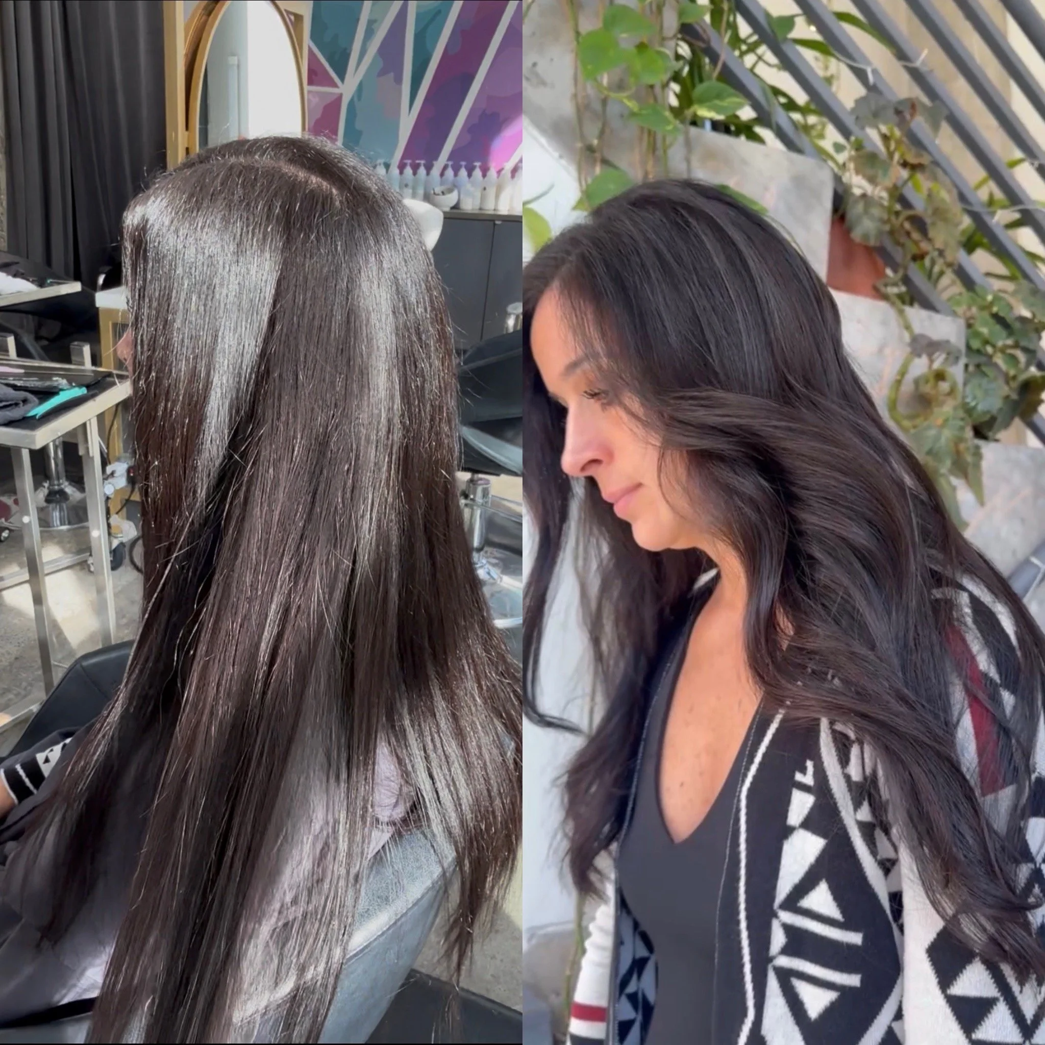 The result is a soft, dimensional brunette that looks rich, glossy, and natural—not streaky or overly processed.